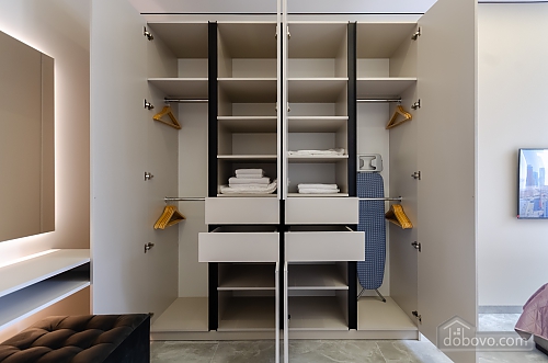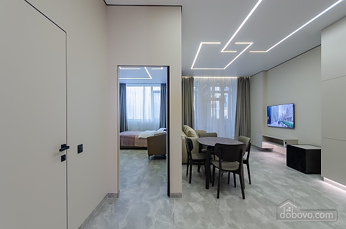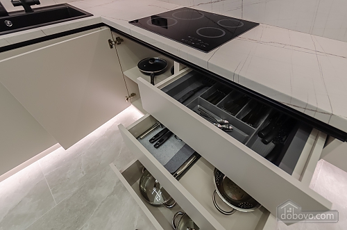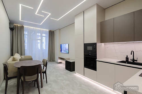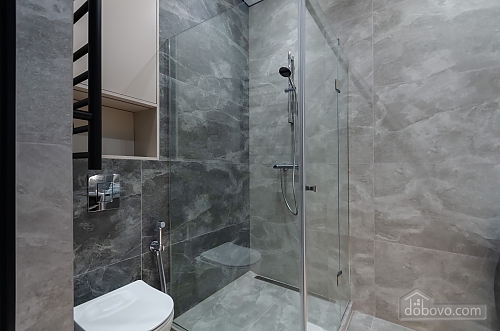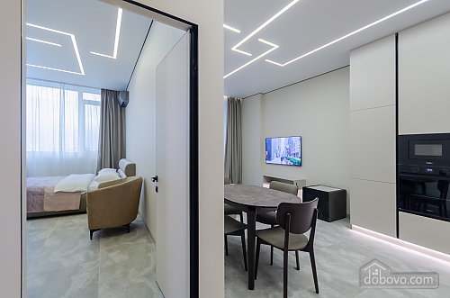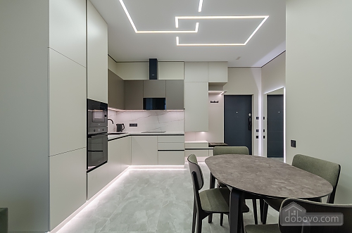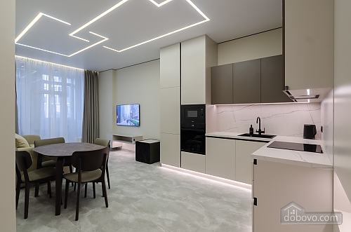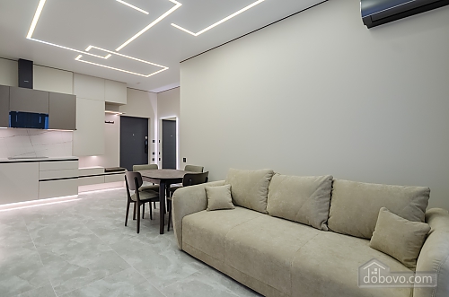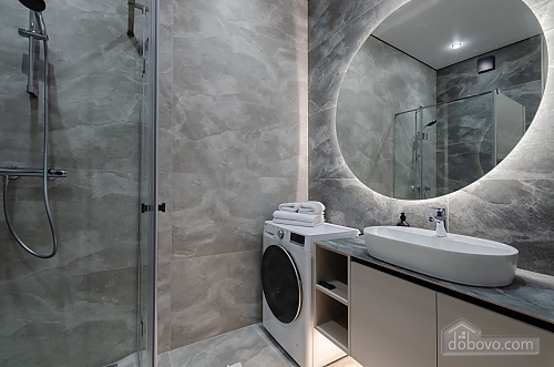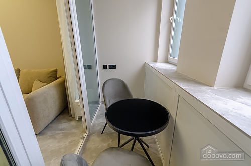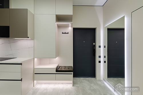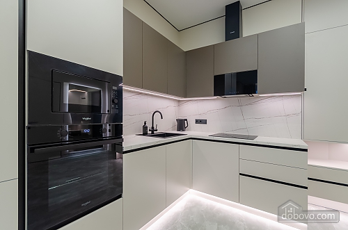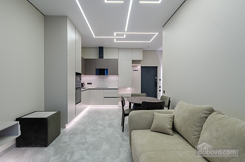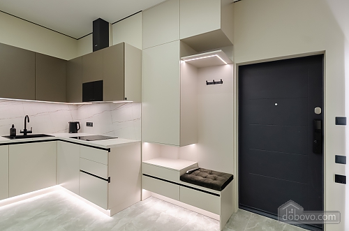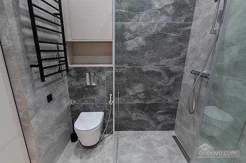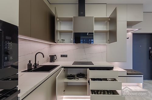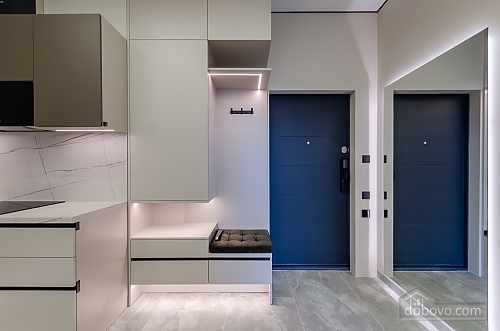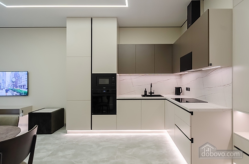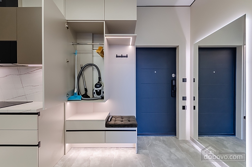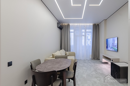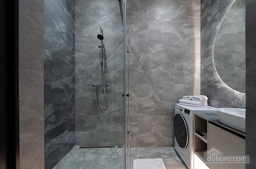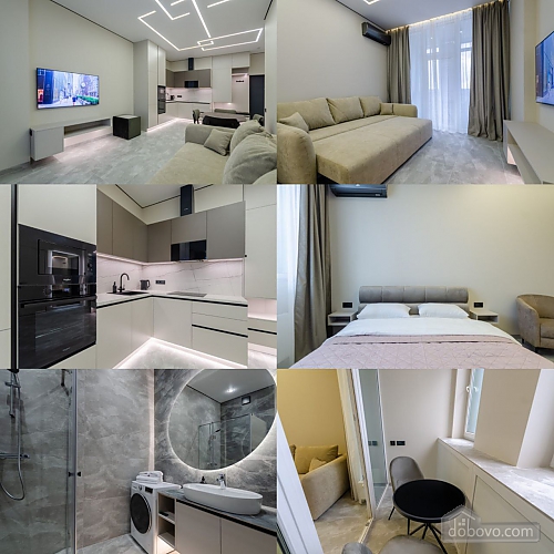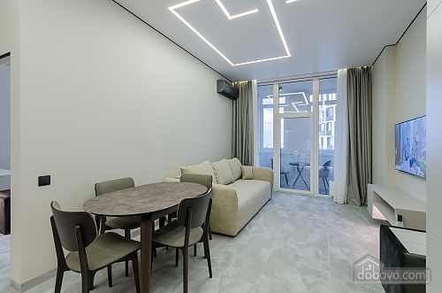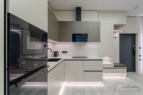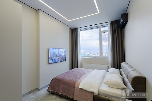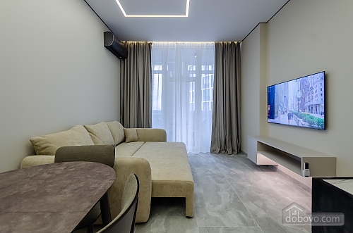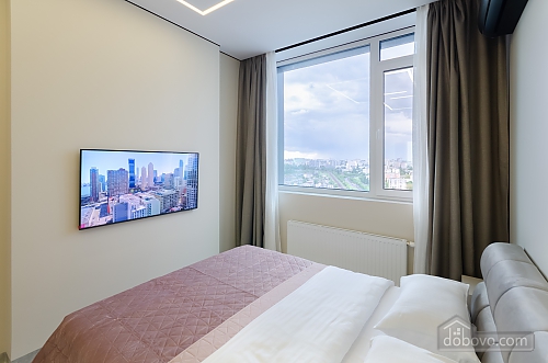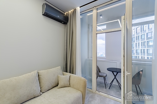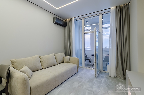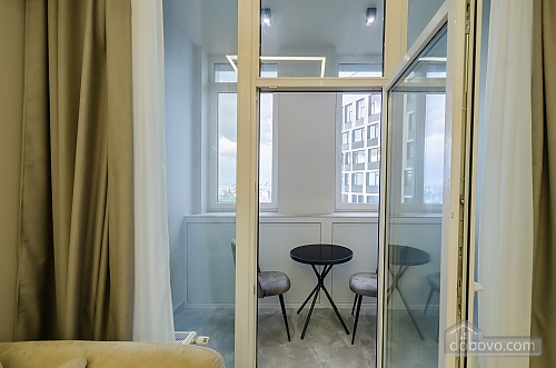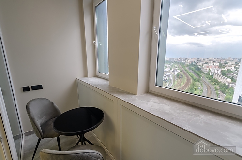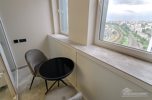 The apartment is located on the 33rd floor and offers panoramic views of Kyiv. It has a stylish, modern design and is fully equipped with everything you need for a comfortable stay. The total area is 54 m². Bedroom: comfortable bed (2000 × 1600 mm). Living area: sofa bed (2000 × 1600 mm), air conditioning, Smart TV, access to a glazed balcony. Kitchen area: refrigerator, microwave oven, electric kettle, electric stove, water filters, pots, frying pan, necessary utensils, cups, glasses, dining table with four comfortable chairs. Bathroom: bath-shower, toiletries, hairdryer, towels. Washing machine: washing and drying - in one device, without any hassle. Glazed balcony with table and chairs. Heating in the cold season, underfloor heating throughout the apartment and on the balcony. Smart lock: entry by code, which allows you to move in at any time without the presence of the owners. Parking is available for an additional fee - check availability. For your convenience, there is a Bartscher shoe shine machine in the main lobby of each building.Main Facilities