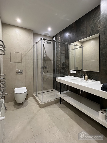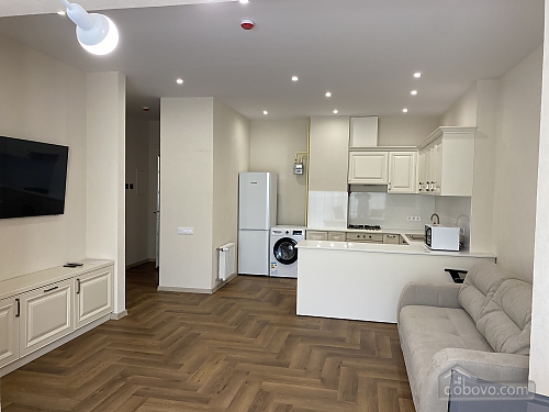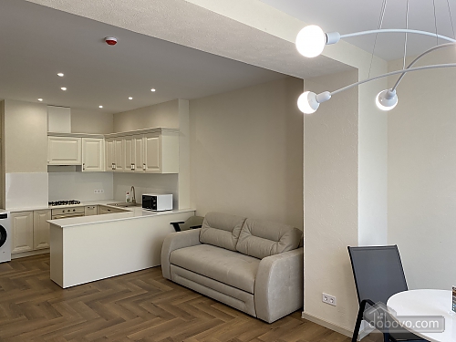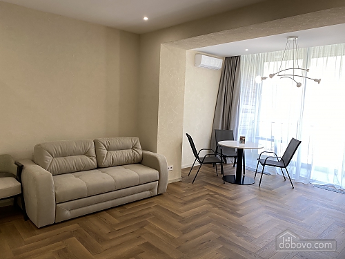 Apartment with pool view. • Area: 70 m² • Sleeping accommodations: separate bedroom with double bed + fold-out sofa in the living room for two people. • Features: • Separate rooms, creating a sense of privacy even during long stays. • Fully equipped kitchen with dining area. • Modern bathroom with shower and hairdryer. • Work area — desk and comfortable chair. • Air conditioning, Wi-Fi, Smart TV. • Interior: minimalism with warm accents, cozy soft lighting. Suitable for long-term stays, families, and business guests. Distance to the sea — 30 meters, access to the coast via a convenient footpath. Fifty meters away, on one of the beaches, is the Korablik restaurant with a lounge area and a playground, where you can comfortably spend the whole day. A five-minute walk away is the popular Riba restaurant, where you can enjoy exquisite seafood cuisine. • Apartments with a secure area, ensuring safety and privacy. • The property has private parking (150 UAH/day), an elevator, video surveillance, and a swimming pool. You can also rent mini-gyroboards, bicycles, and table tennis.Main Facilities