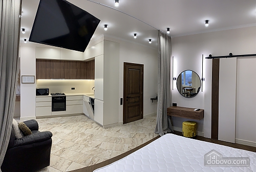 Квартира-студия расположена на последнем этаже 9-этажного дома. Имеется огромная терраса с удобной мебелью и с потрясающим видом на город. Жилье оснащено всеми необходимыми предметами для короткого и длительного пребывания.Основные атрибуты