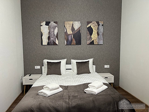 Апартаменты Премьер с одной спальней (71 м²) Просторные апартаменты класса премиум с одной спальней площадью 71 м². Количество мест - 4: односпальная кровать на 2 человека и большой двухместный диван на 1 человека. В апартаментах предоставляется бесплатный Wi-Fi и бесплатная общественная парковка на территории. По запросу доступна детская кроватка, а также есть утюг и гладильная доска. Ванная комната оснащена бельем, бесплатными туалетно-косметическими принадлежностями, душем, ванной, биде, мылом, полотенцами, тапочками, туалетной бумагой, туалетом, феном и шампунем. Кухня оборудована микроволновой печью, обеденным столом на 4 стула, плитой, духовым шкафом, холодильником, электрочайником, капсульной кофеваркой, посудой и принадлежностями, а также кофе и чаем. Есть также стиральная машина. В гостевой комнате установлен телевизор с плоским экраном и Smart TV, доступ к медиа сервису «Megogo», индивидуальное отопление и кондиционер.Основные атрибуты