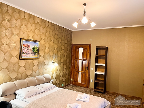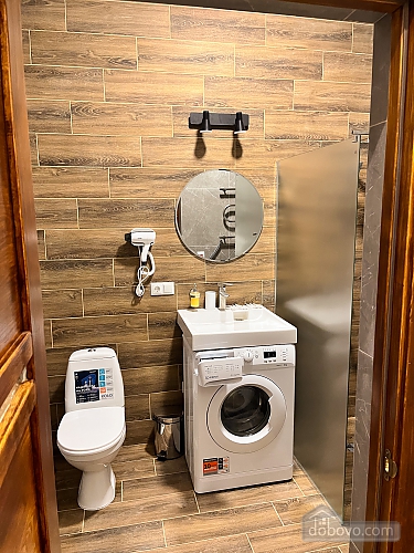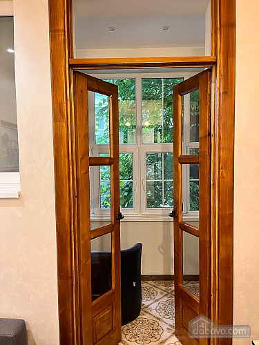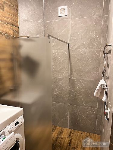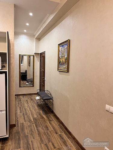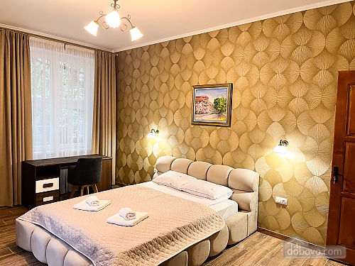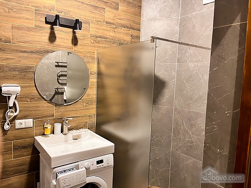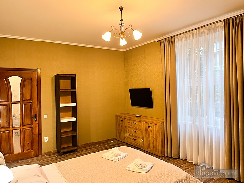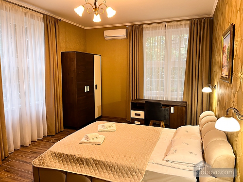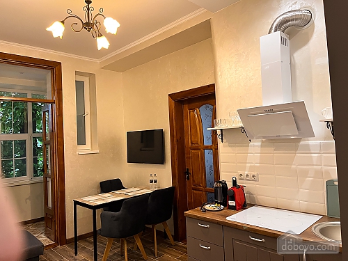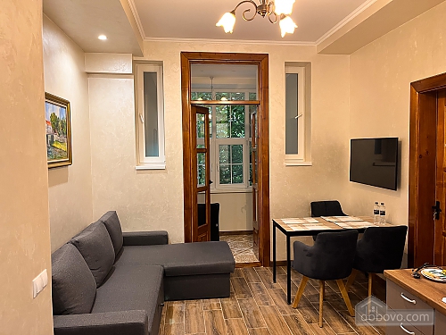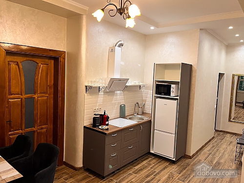 Premium apartment with one bedroom - large premium class apartment (55 m²). Number of beds - 4; double bed - 1; large double sofa bed - 1. Free Wi-Fi; ground floor; free public parking on site. A baby cot is available upon request. An iron and ironing board are available. Bathroom: linen; free toiletries; shower; soap; towels; slippers; toilet paper; toilet; hairdryer; shampoo; washing machine. Studio with kitchen: microwave; dining table; 4 chairs; induction hob; refrigerator; electric kettle; capsule coffee maker; dishes and utensils; coffee and tea; flat-screen TV and Smart TV; Megogo media service; individual heating; air conditioning. Bedroom: double bed; wardrobe; pencil case; chest of drawers; desk; flat-screen TV; air conditioning.Main Facilities